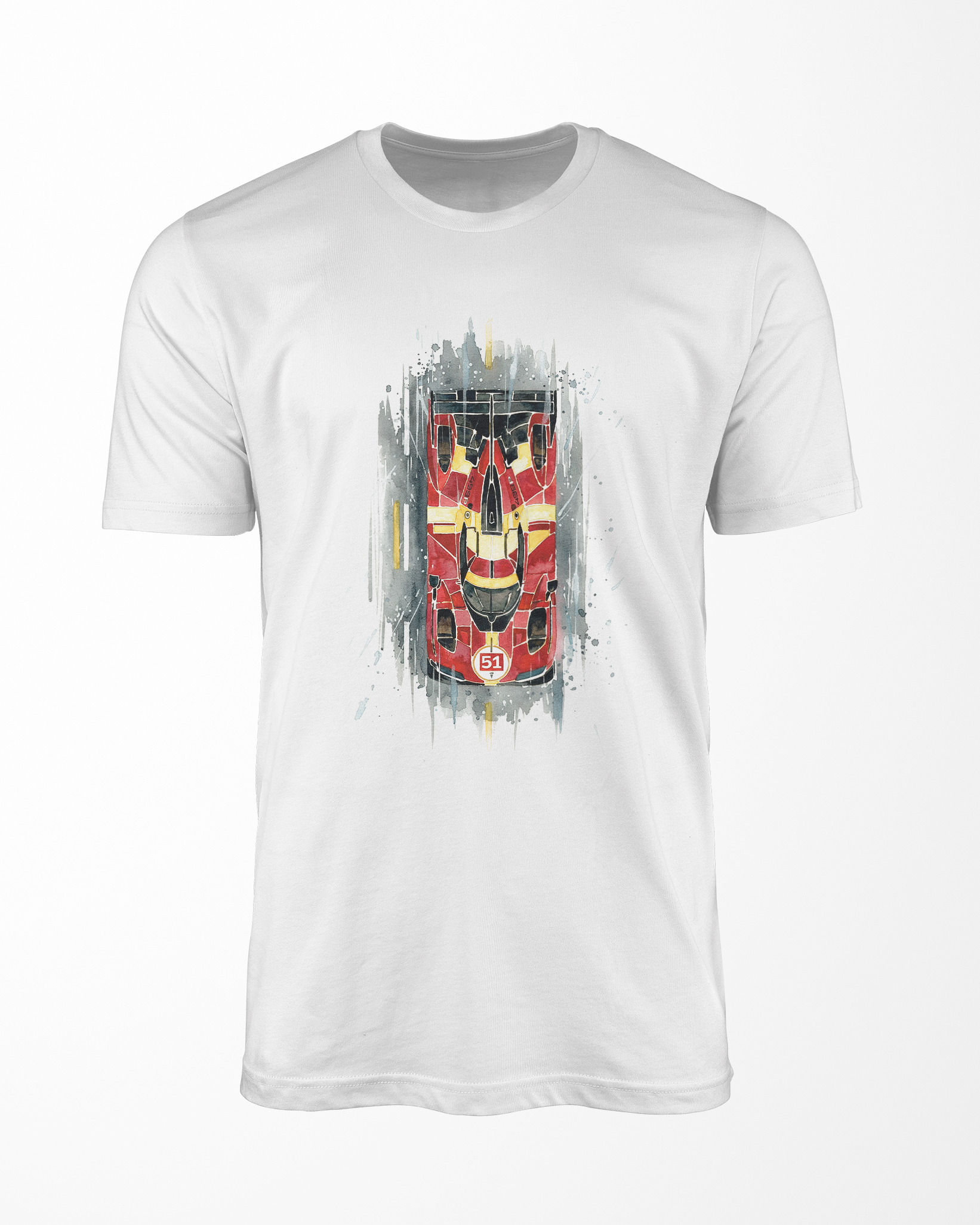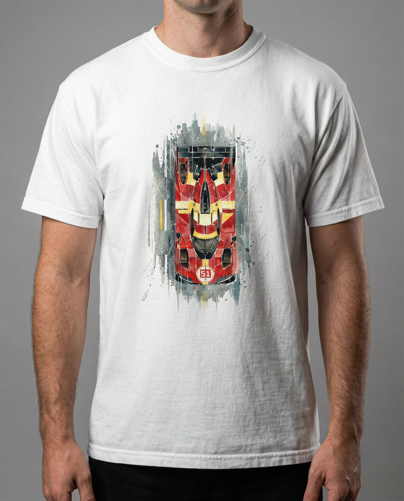 A arte captura um protótipo de corrida em sua forma mais pura: carroceria larga, entradas de ar agressivas, cockpit fechado e o número 51 marcando presença na dianteira. Uma máquina criada para horas de resistência, estratégia e precisão absoluta.