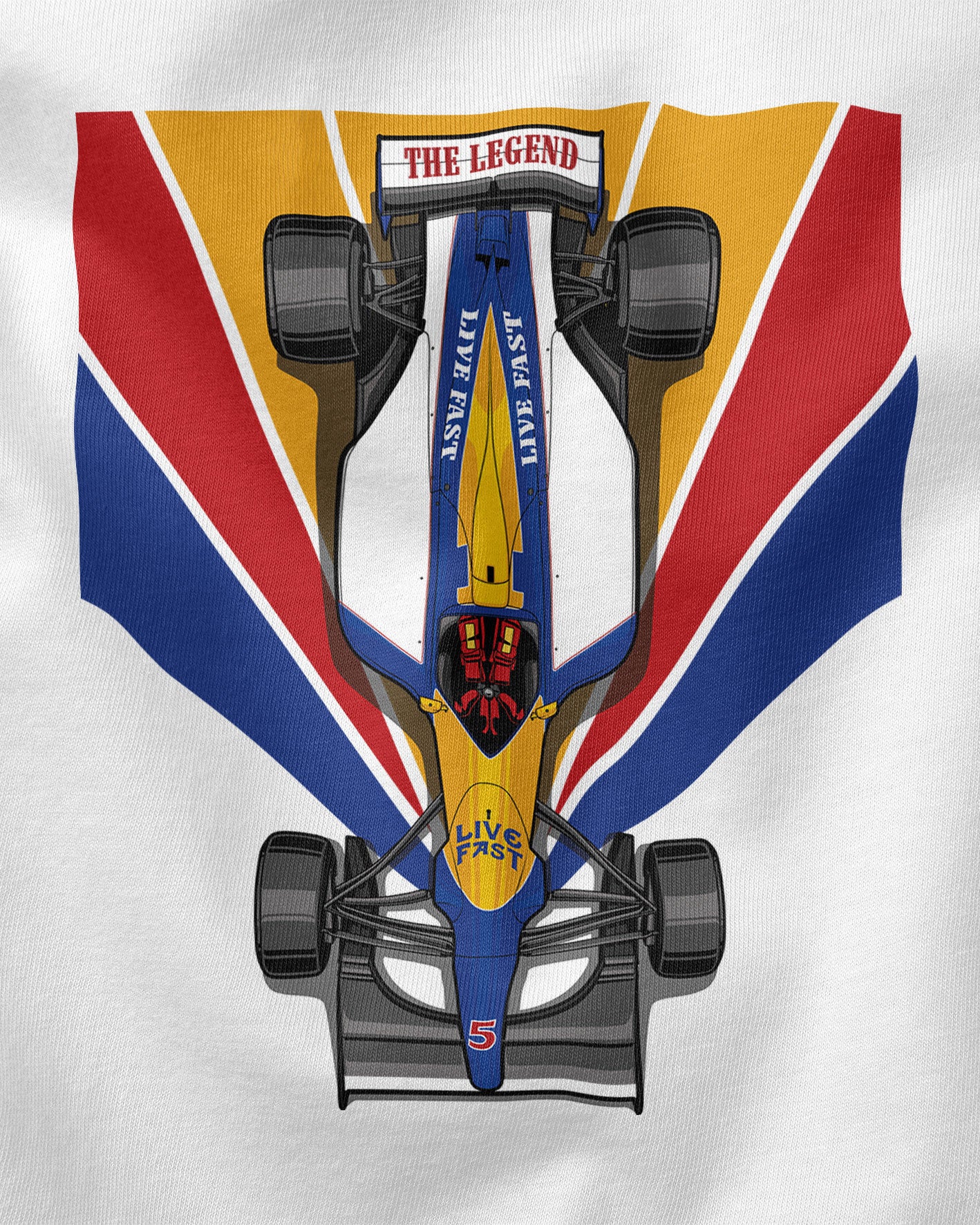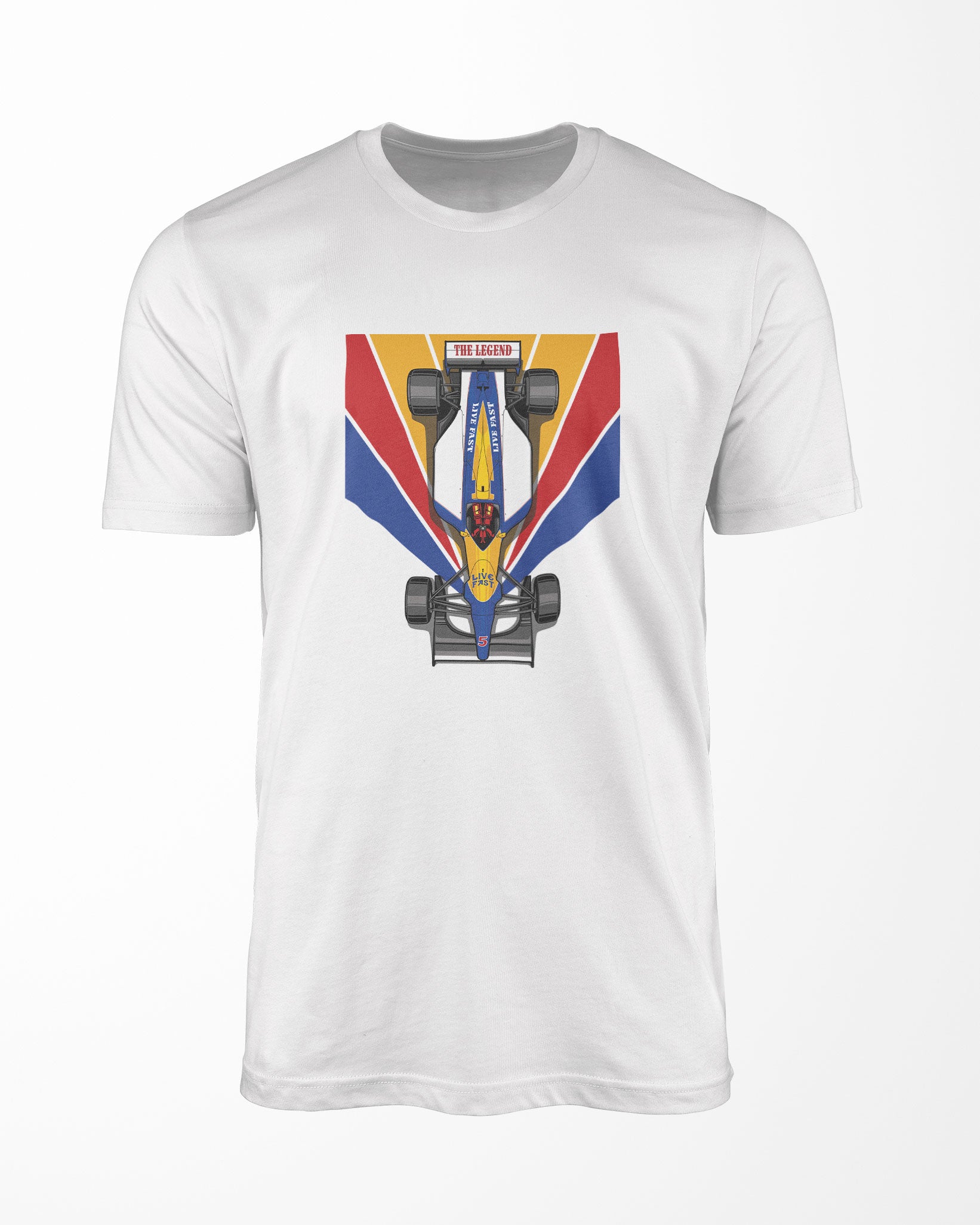 Essa camiseta celebra um dos maiores ícones da história do automobilismo mundial. Com uma estampa estilizada do lendário FW14B, um dos carros mais revolucionários da Fórmula 1, ela traz as cores marcantes de azul, vermelho e amarelo, que remetem à gloriosa era da Williams nos anos 90. O design destaca o topo do carro com a inscrição “The Legend”, um tributo à engenharia e ao desempenho que redefiniram o esporte.