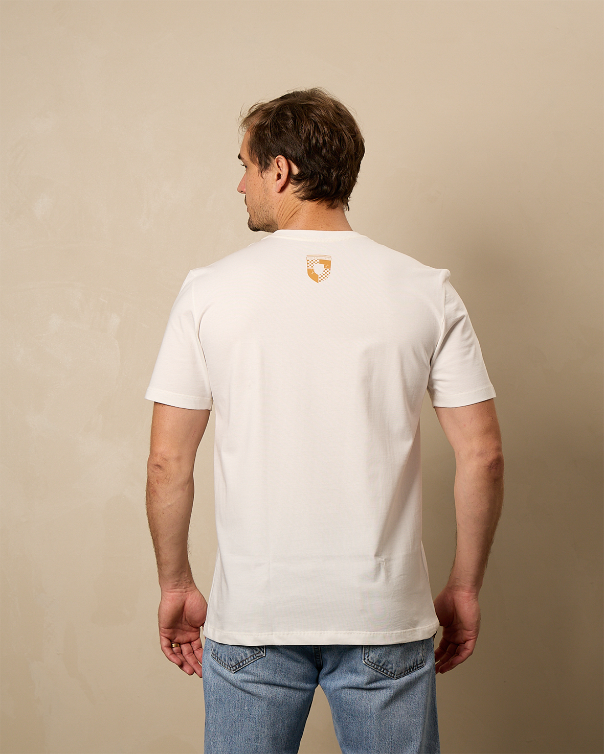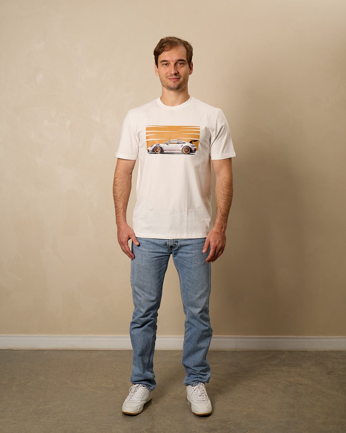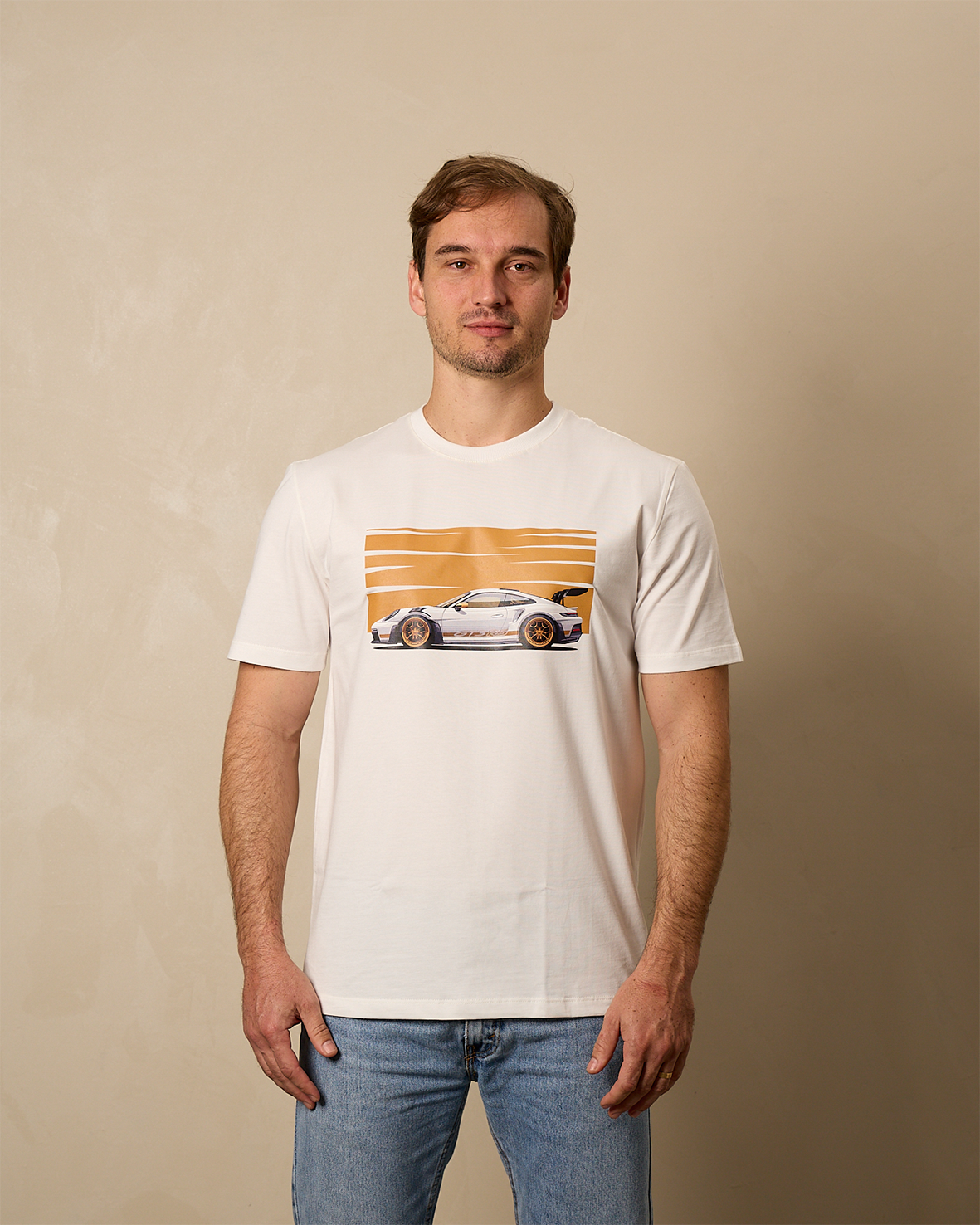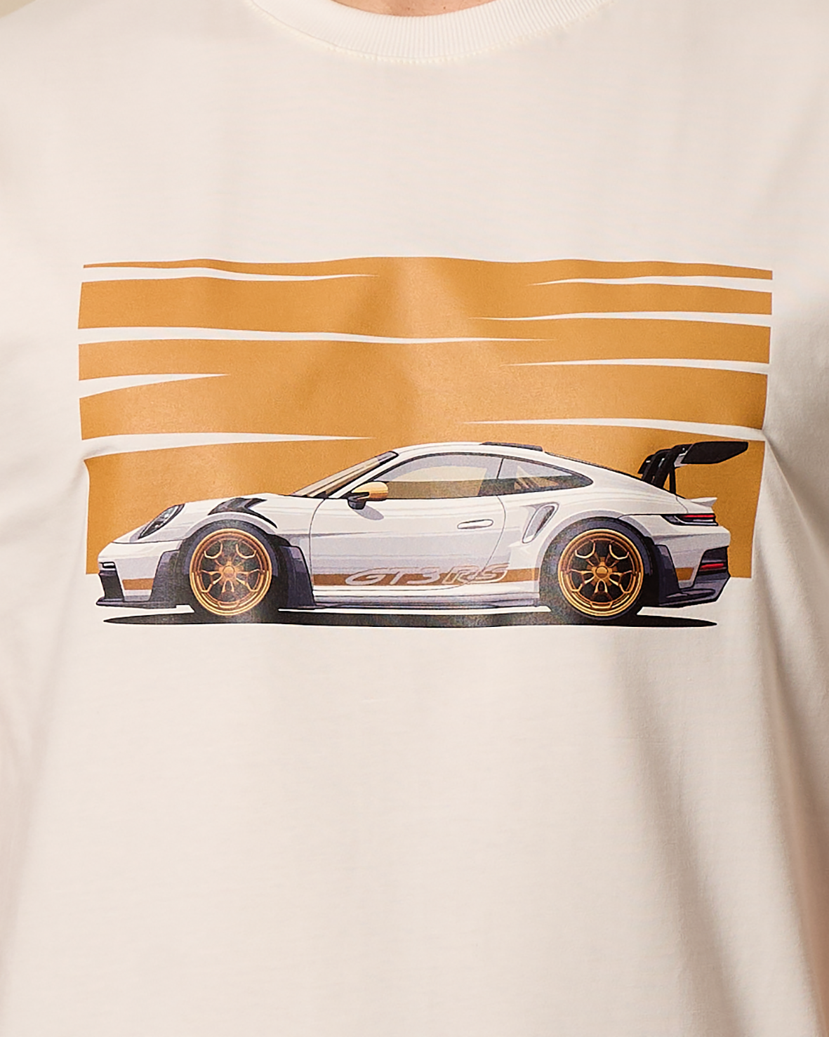 Um grito de guerra em forma de tecido. Essa camiseta traz o ícone absoluto das pistas: o Porsche 911 GT3 RS, na sua forma mais agressiva, esculpido sobre um fundo dourado que evoca o calor do asfalto e a glória dos circuitos lendários.
