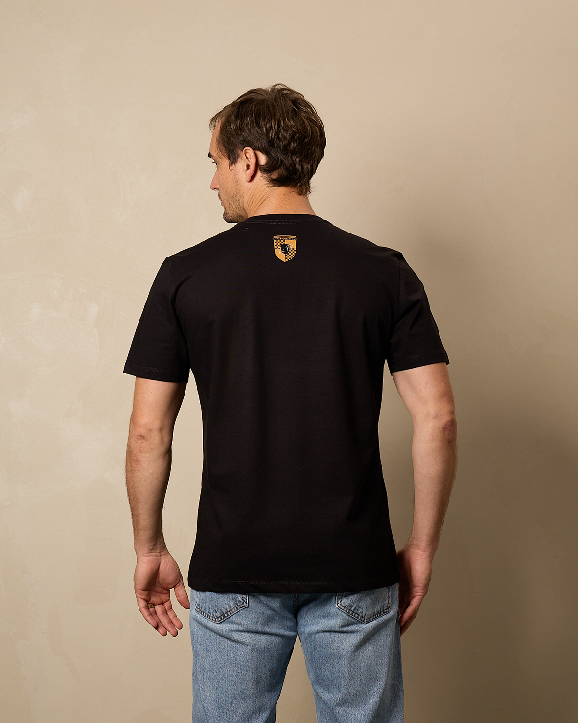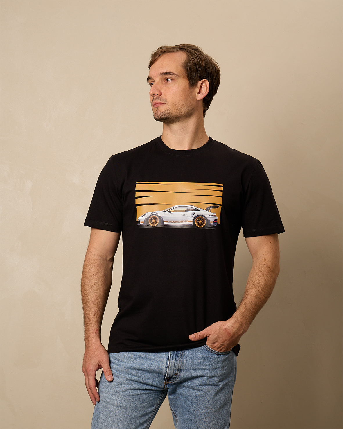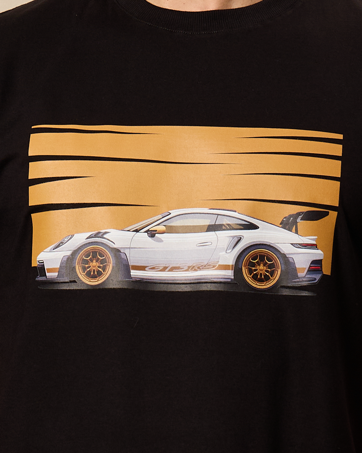 Um grito de guerra em forma de tecido. Essa camiseta traz o ícone absoluto das pistas: o Porsche 911 GT3 RS, na sua forma mais agressiva, esculpido sobre um fundo dourado que evoca o calor do asfalto e a glória dos circuitos lendários.