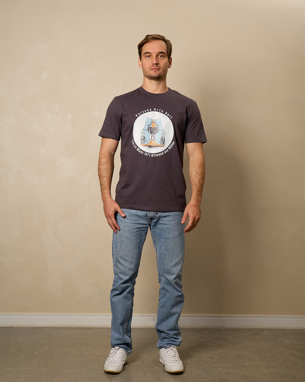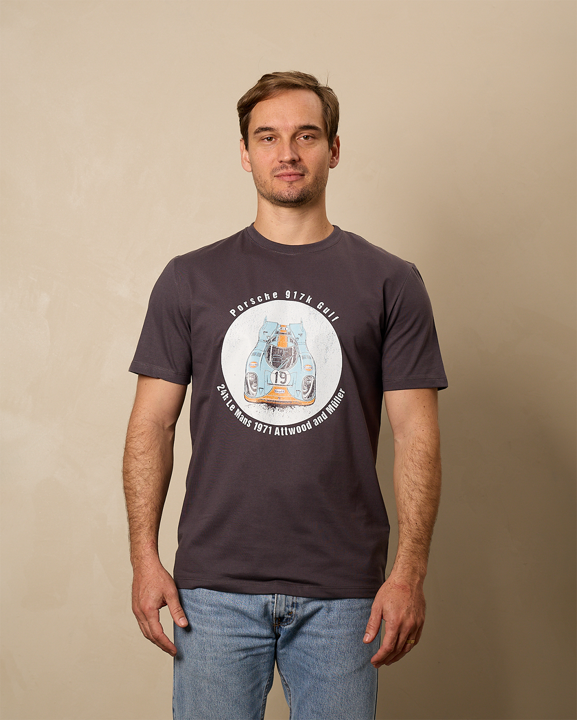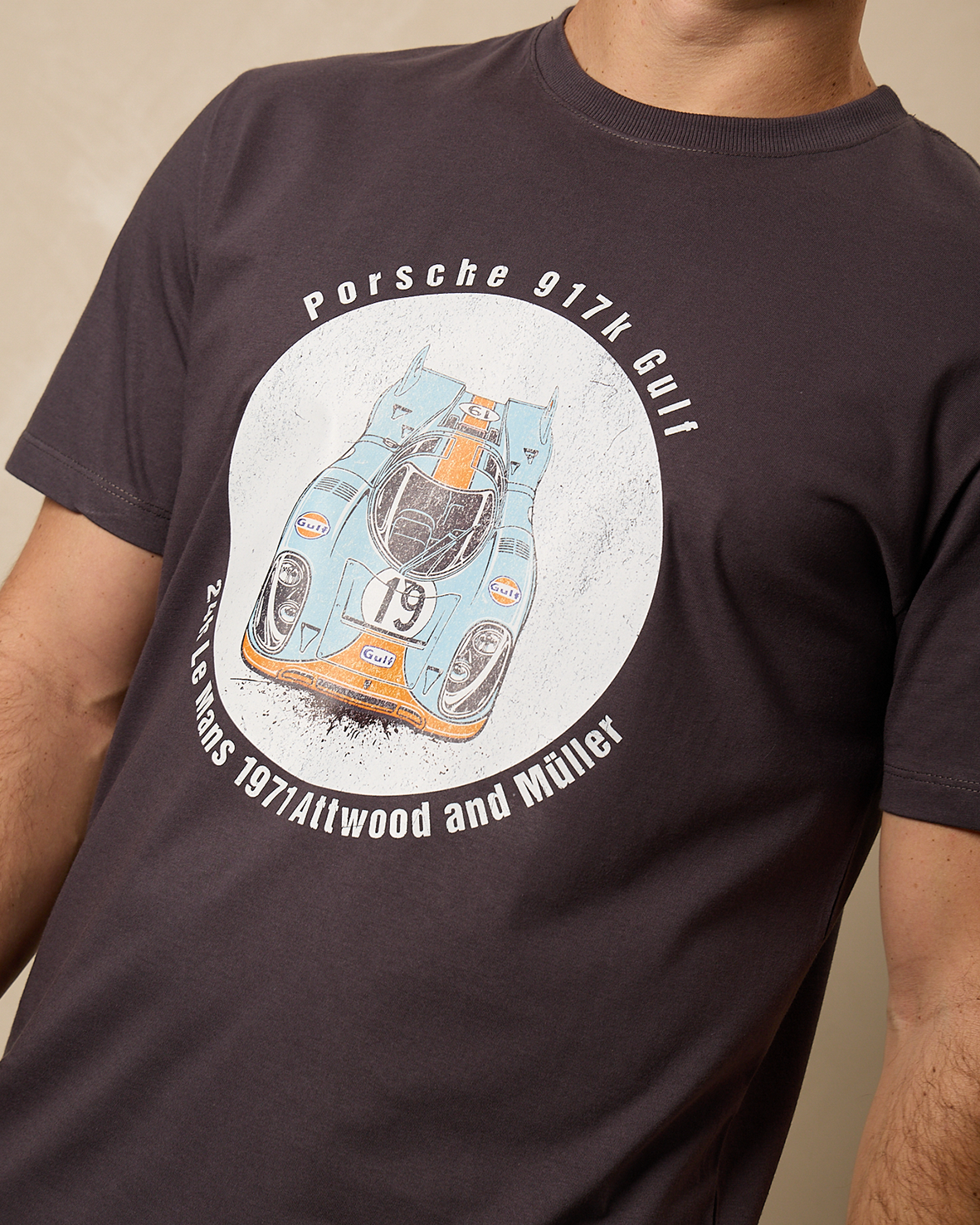 A estampa traz o icônico Porsche 917K com as lendárias cores da Gulf, eternizado na edição de Le Mans 1971. Pilotado por Richard Attwood e Herbert Müller, o carro número 19 virou símbolo de resistência, velocidade e design marcante. É um tributo direto a uma das máquinas mais emblemáticas da história do automobilismo.
