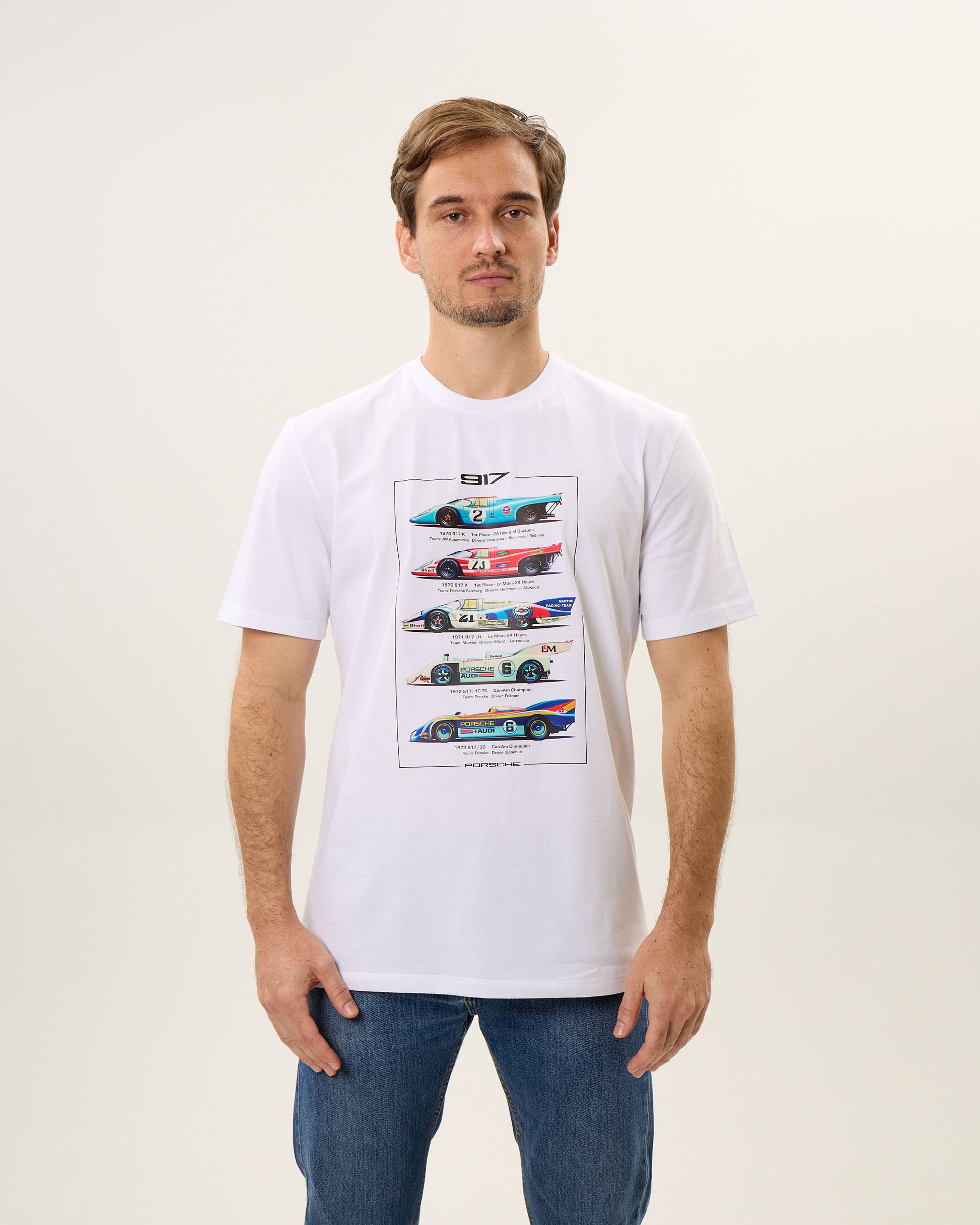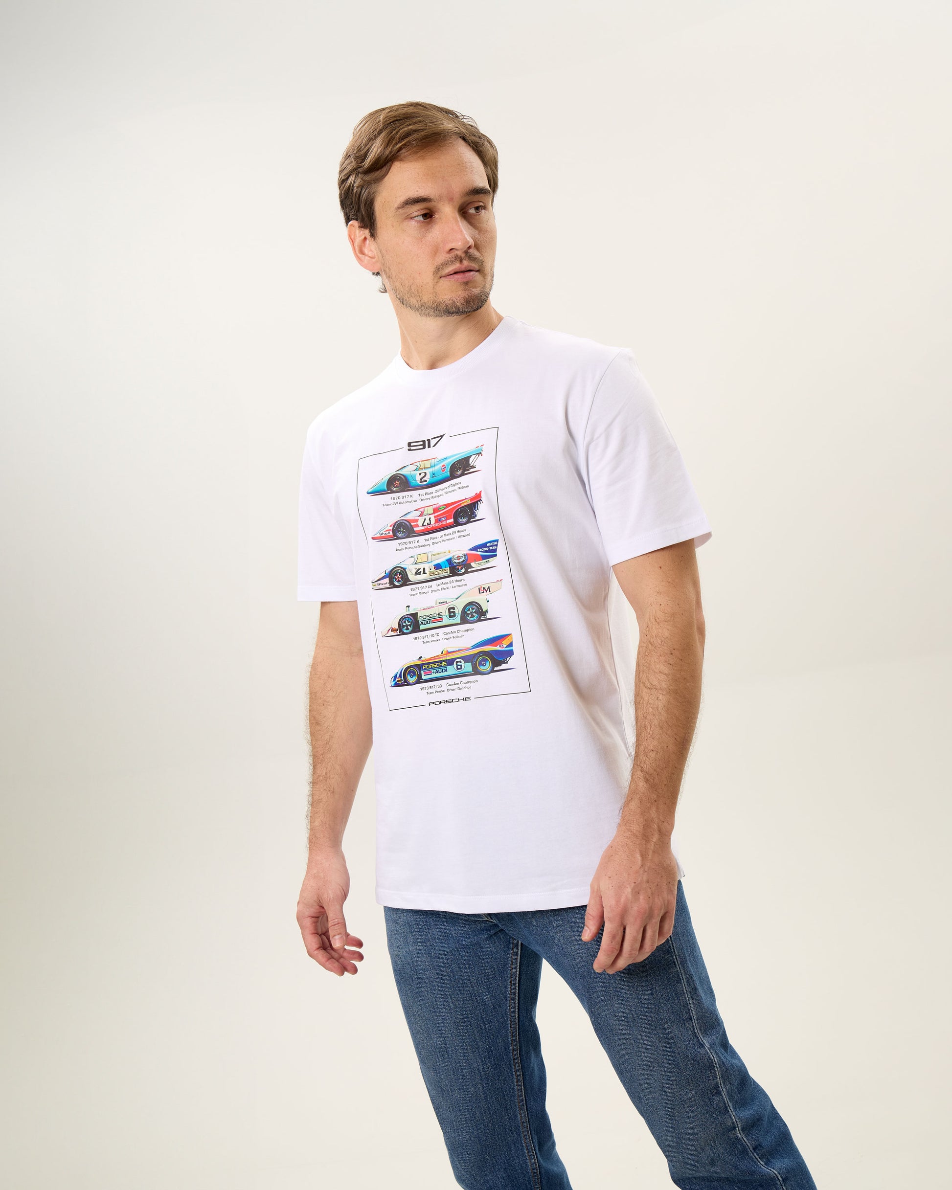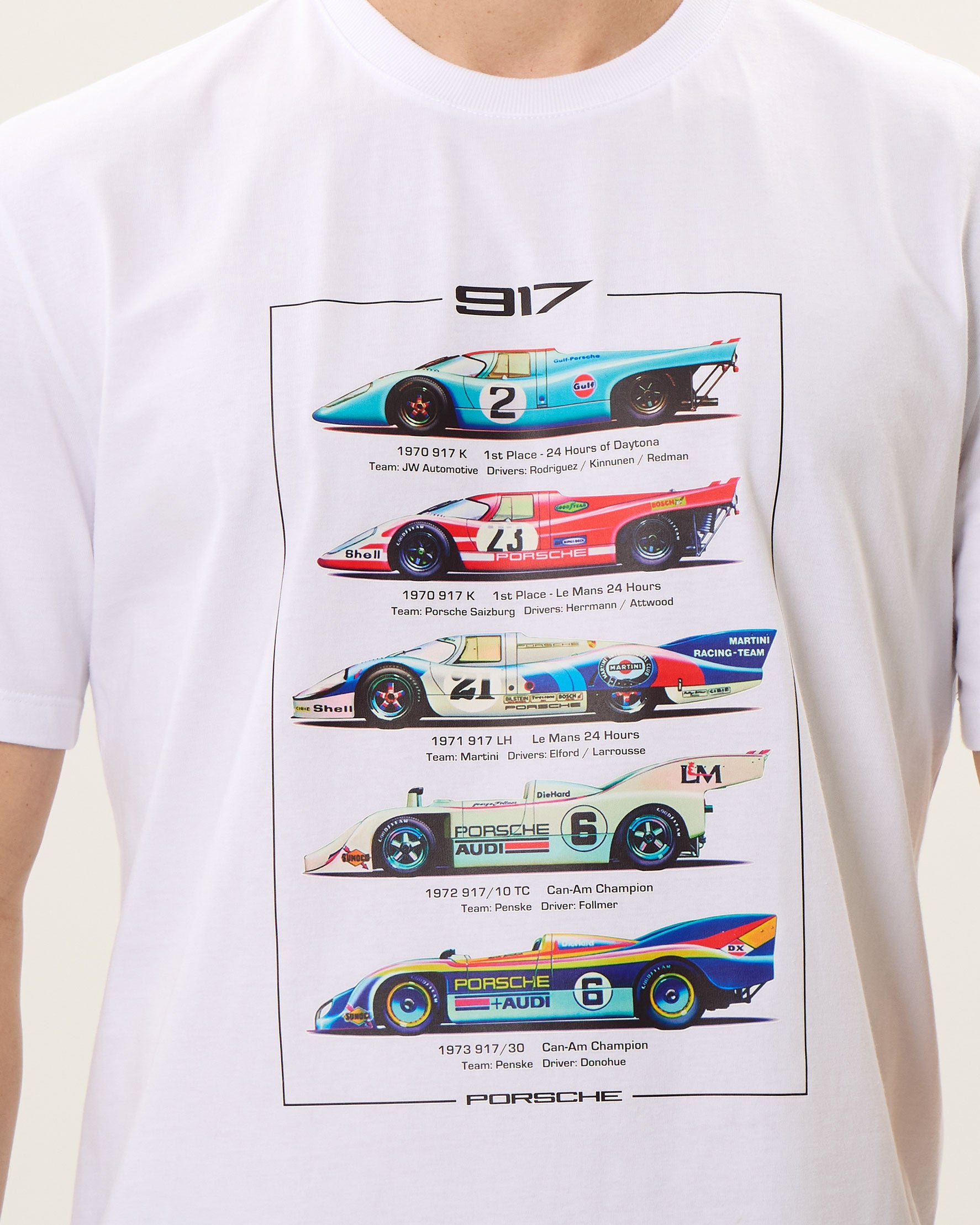 Celebre a lenda das pistas com esta camiseta de alta qualidade, homenageando o icônico Porsche 917 e suas evoluções dos anos 70. A estampa vibrante captura a essência e as cores emblemáticas deste gigante do automobilismo, ideal para fãs e colecionadores. Confortável e durável, é perfeita para expressar paixão e estilo, seja em passeios casuais ou encontros de aficionados por carros. Uma verdadeira peça de colecionador que traz um pedaço da história do automobilismo em cada detalhe.