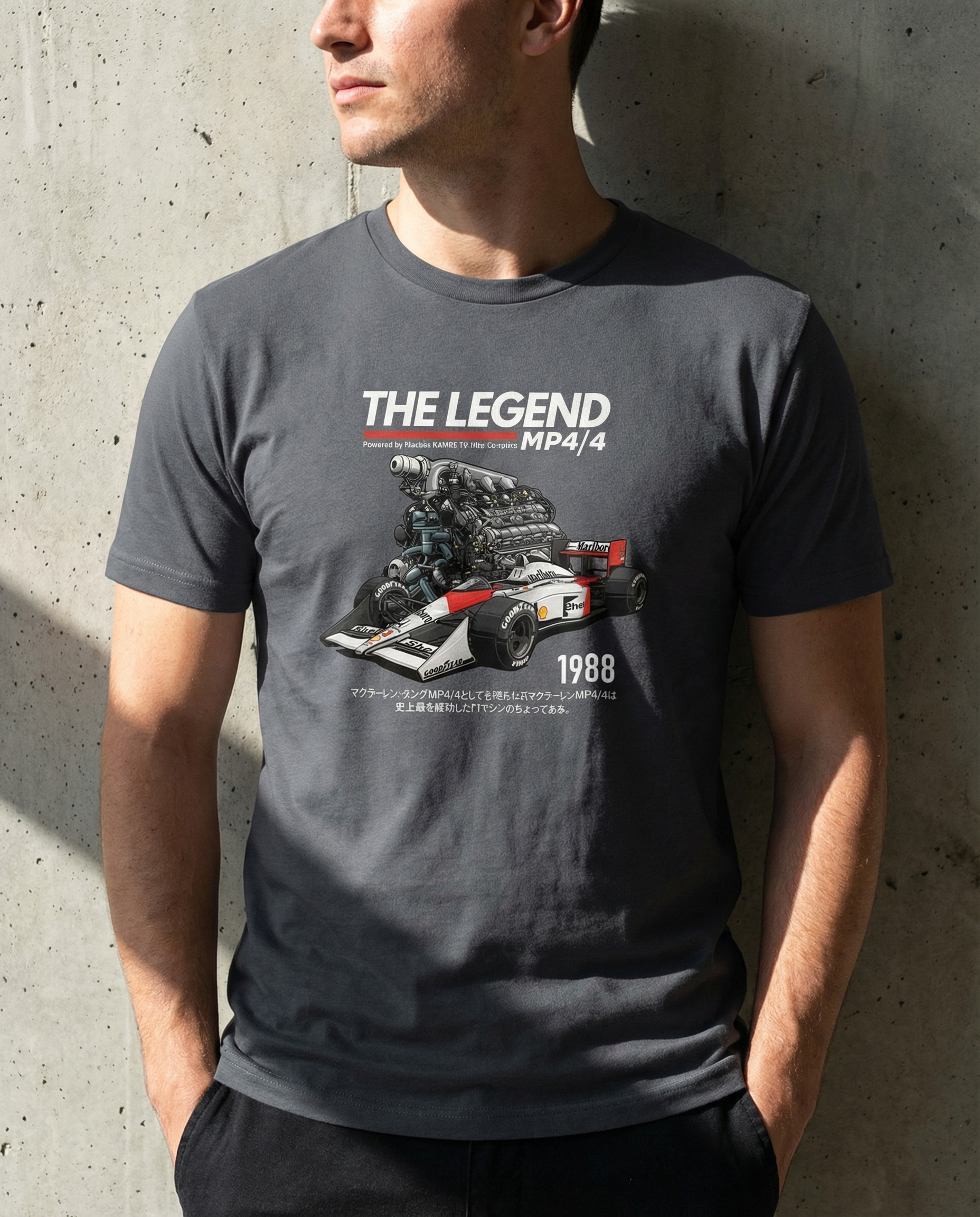 Reviva a era dourada da Fórmula 1 com esta incrível camiseta estampada com o icônico McLaren MP4/4, o carro que dominou a temporada de 1988. A arte detalhada destaca o lendário motor Honda RA168E 1.5-litre V6-turbo, um verdadeiro símbolo de engenharia e performance.